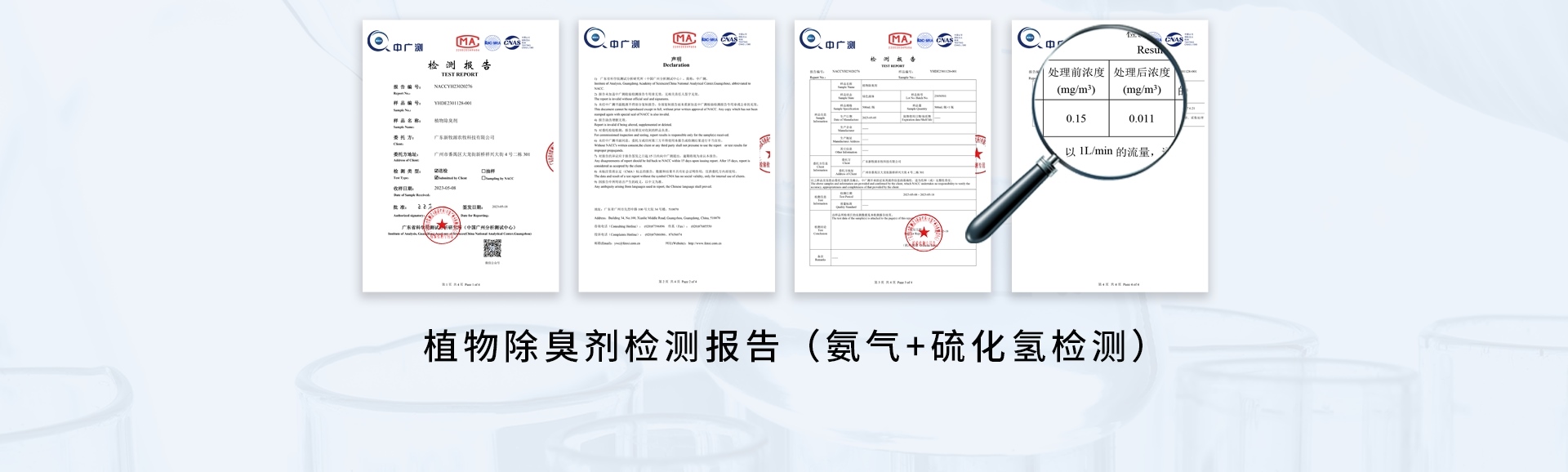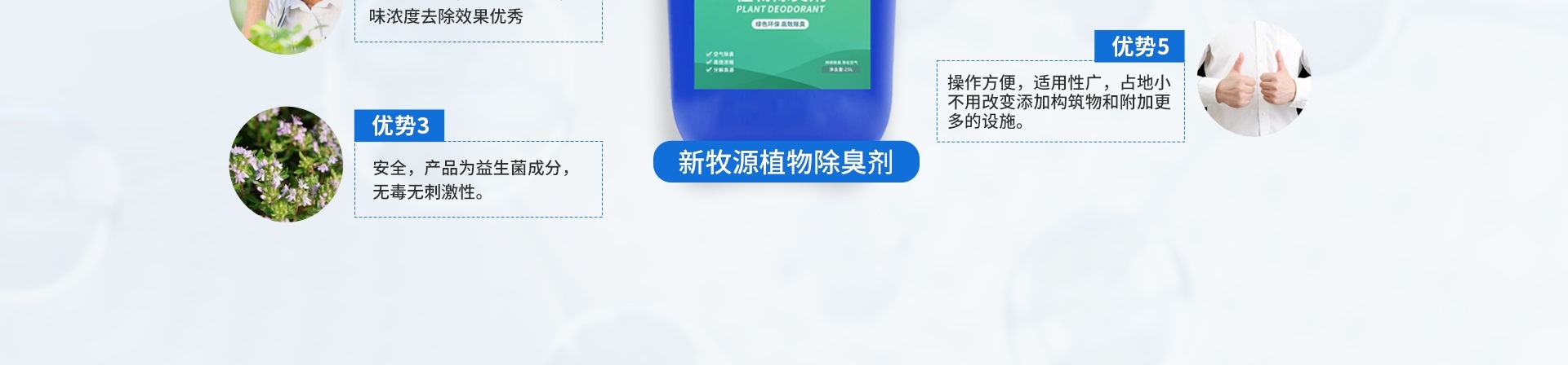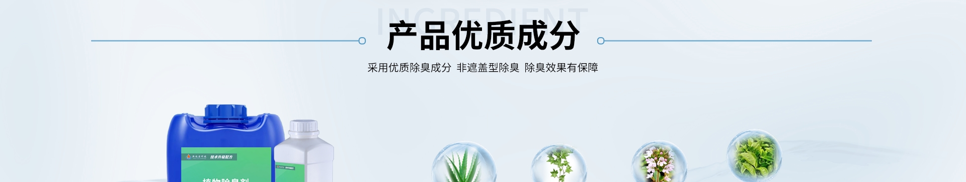 從天然植物中分離提取的天然成分,具有抑菌、殺菌和除臭功效,對(duì)氨、硫化氫等無(wú)機(jī)物和低分子脂肪酸、胺類(lèi)、醛類(lèi)、酮類(lèi)、醚類(lèi)、鹵代烴等有機(jī)物等惡臭有吸附、遮蓋、良好的分解,或者與異味分子發(fā)生碰撞, 進(jìn)行反應(yīng),促使異味分子發(fā)生改變?cè)蟹肿咏Y(jié)構(gòu), 使之失去臭味,達(dá)到去除臭味的效果。